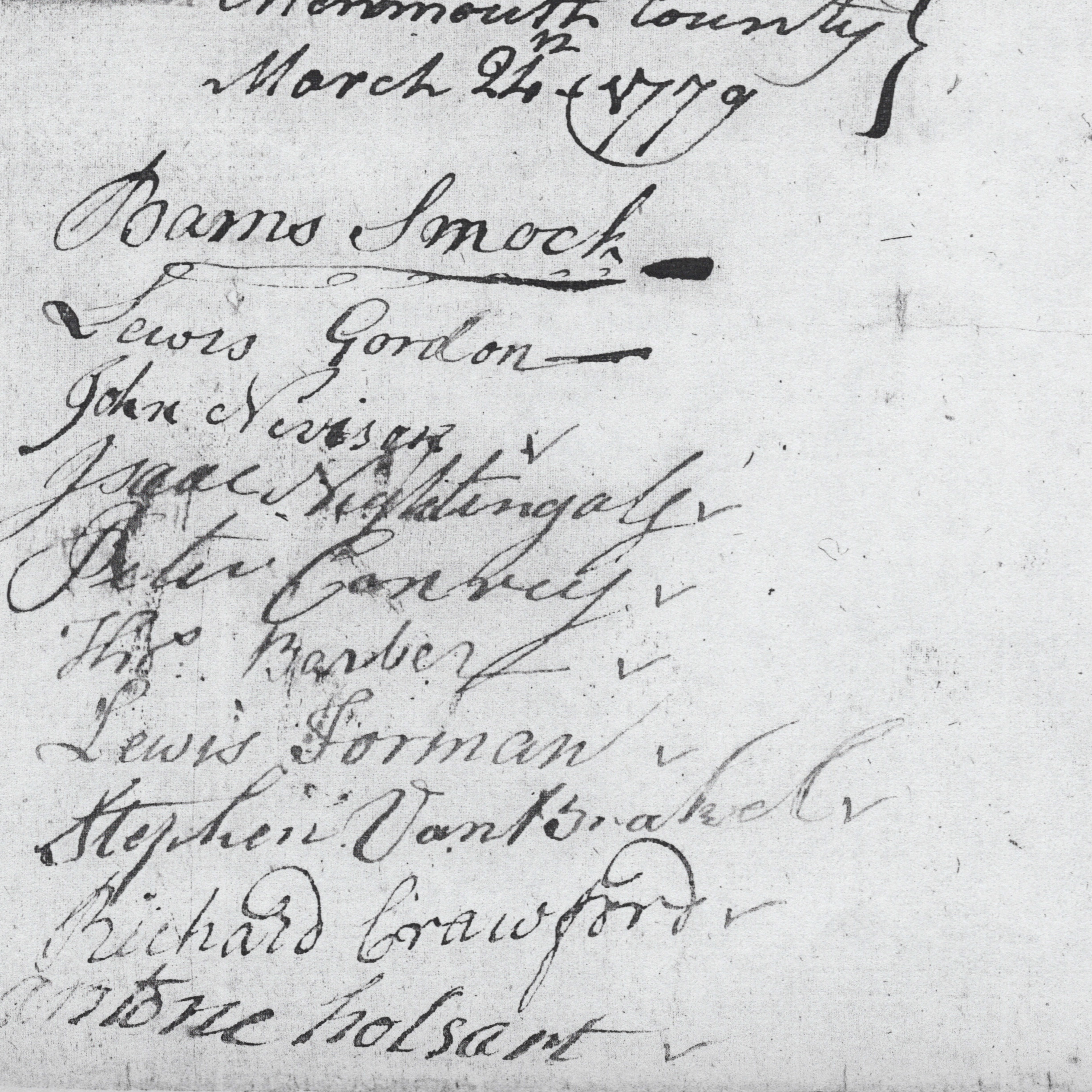 Whereas Great and Grevious Complaints are duly making and have been made against the present, as well as the former proceedings of the Commissioners Appointed by Law for taking charge of and {?} of the forfeited Estates of certain Fugitives and Offenders of said County – We therefore earnestly pray that the Commissioners can be called upon by your Honours as early as may be Convenient to account for their conduct in disposing of siad Estates; and that two or three Gentlemen be Appointed in said County to bring forward witnesses to the above Charges, and that the Representatives of the County in the Council and General Assembly be requested to Give notice to the Inhabitants of said County of time and place appointed for such a hearing – so that justice may be done as well to the Commissioners as to the State for which your petitioners as in duty bound shall ever pray —- Monmouth County 24 MAR 1779.